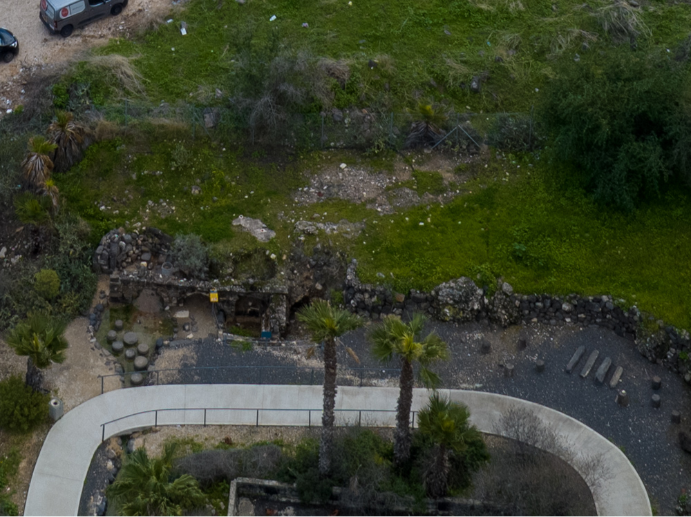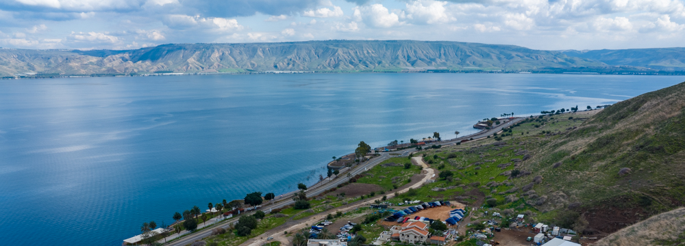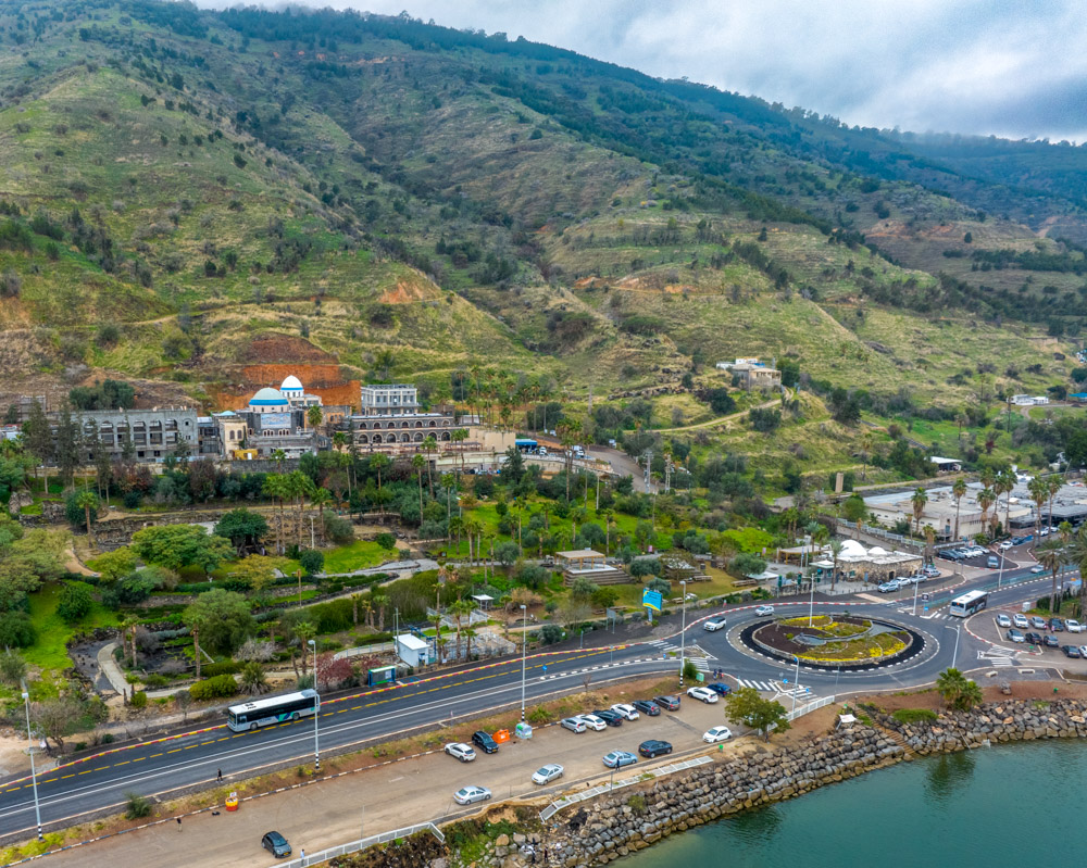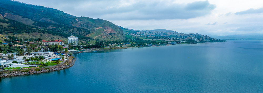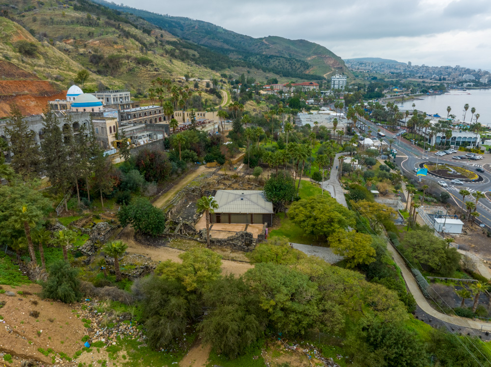 View north: The western shore of the Sea of Galilee with Tiberias (top right) and Hammat Tiberias (bottom right). The tomb of Rabbi Meir (center right) and the Severus synagogue (bottom right) are also visible.