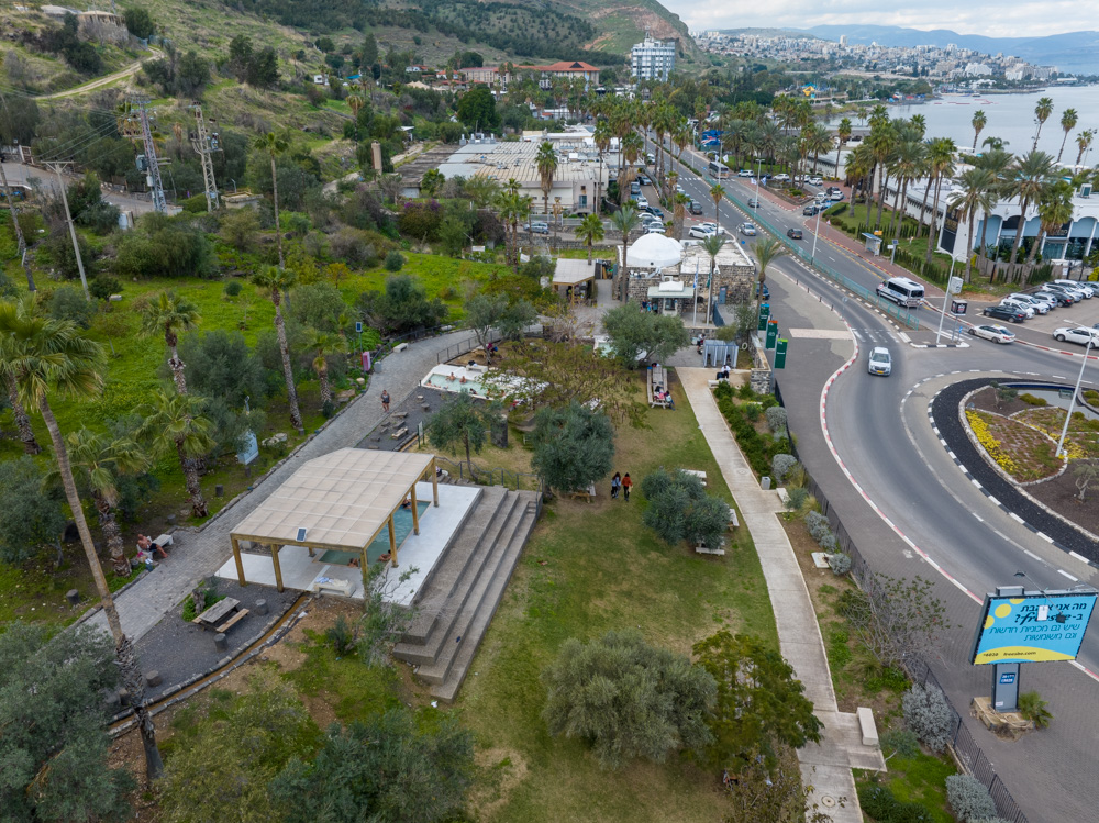View west: tomb of Rabbi Meir (center left) and the Hammat Tiberias National Park, including the entrance (bottom right) and pools (bottom center). The Severus synagogue is behind the trees (bottom left).