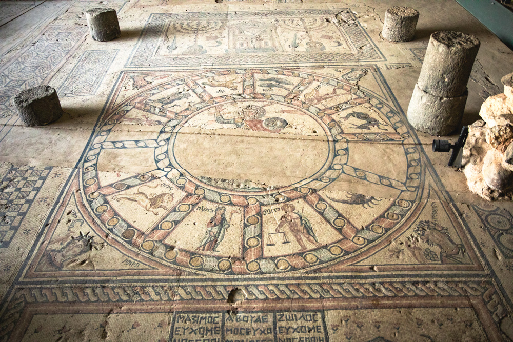 View northeast: The mosaic floor is part of the second synagogue (third to fourth centuries AD). The southern panel (top) depicts the Holy Ark and two seven-branched candelabras.