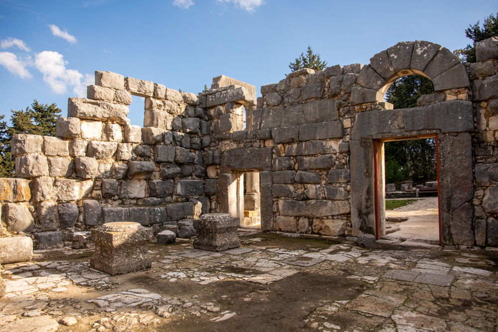View northwest: The main entrance to the synagogue, which dates to the late fourth or early fifth century AD. Six pillars supported the portico that once stood in front of the synagogue entrances.