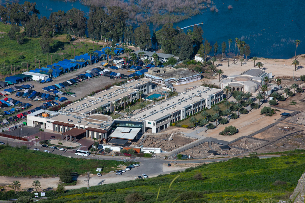 View east: Magdala from the trail descending the eastern side of Mt. Arbel hiking toward Tiberias. You can see the roof over the synagogue (bottom center), the Magdala Hotel (center), the southern excavations of magdala, and the Duc In Altum church (center right).