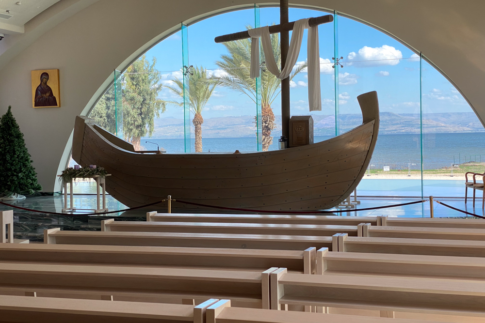 View east: The altar at the end of the church’s main hall is shaped like a first-century AD fishing boat. It is situated on a raised apse paved with green marble, making it appear to be on the lake itself.