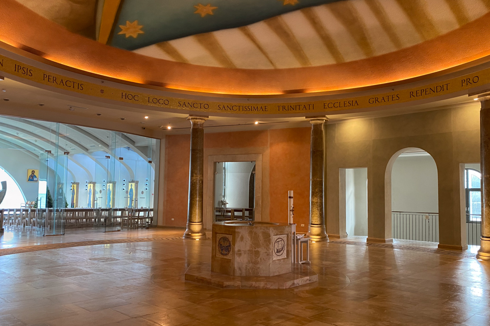 The women’s Atrium inside the Church is surrounded by eight pillars—seven with names of women mentioned in the gospels and one without a name dedicated to all women who visit the church.
