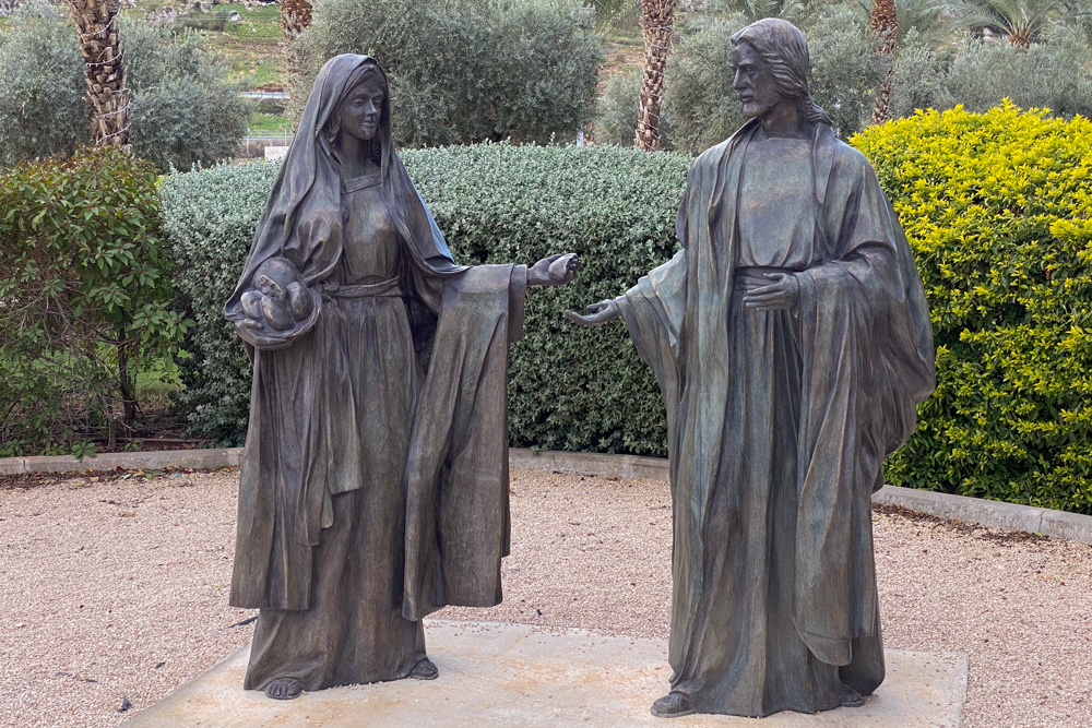 The Encounter chapel is inside the church, built around a paved courtyard dating to the first century. The floor may be from the main fish market located near the wharf of ancient Magdala. The painting behind the chapel’s altar depicts the woman “with an issue of blood” touching the hem of Jesus’s garment (Matt. 9:20–22).