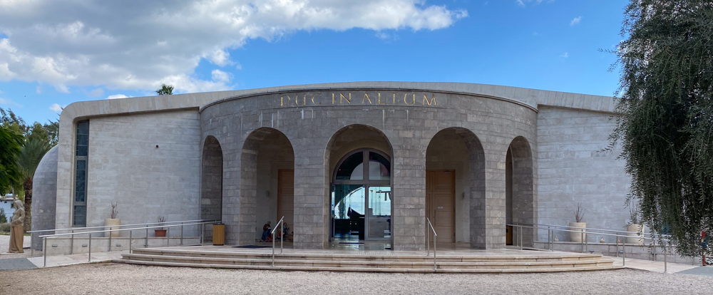 View east: “Duc In Altum” appears above the Magdala Church entrance. It’s Latin for “put out into the deep.” Jesus spoke these words to Simon Peter after he had fished all night without success (Luke 5:4).