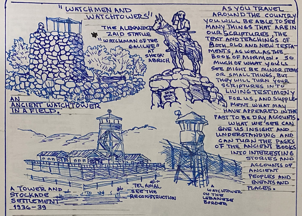 This page is a typical entry from Michael’s journal with sketches and notes about what interested him that day. It focuses on scriptural passages about watchmen and watchtowers and how those themes have carried over into modern history, especially of Israel.