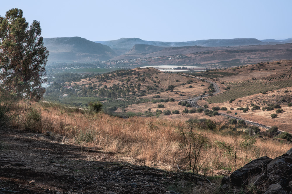 View west: The Old Testament site of Chinnereth (center), the Plain of Gennesaret (left center), Mt. Arbel (top left), the Horns of Hattin, and Mt. Nitai (top center). The white netting covers banana trees.