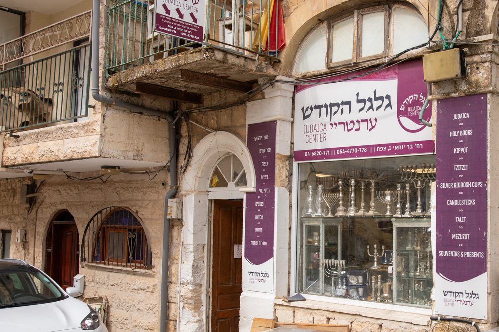This store is an example of one of Safed’s many Judaica shops. In the window you see silver candle holders and menorahs in various styles. The banner on the right advertises other objects for sale.