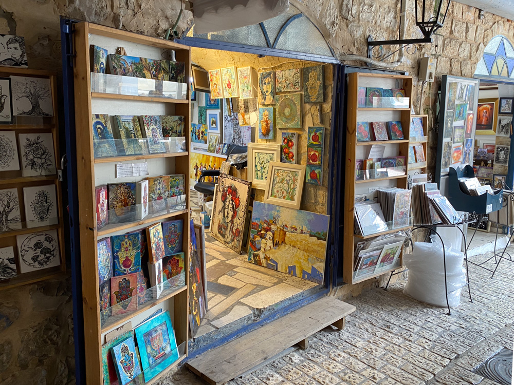 View north: the southern entrance to Safed’s Artists’ Quarter, with shops that sell photography, prints, sculpture, ceramics, handmade jewelry, paintings, and Judaica (Jewish-related objects).