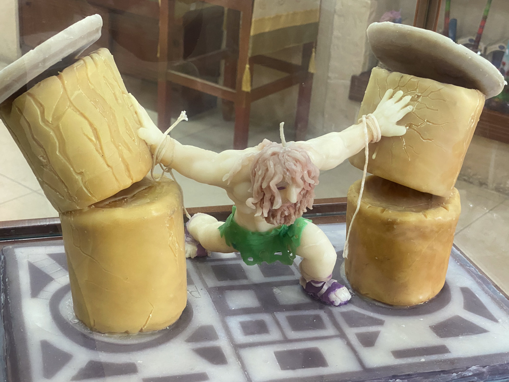 The Safed Candles Gallery contains familiar biblical scenes, including this one of Samson destroying the Philistine building in Gaza, killing himself and three thousand others (see Judg. 16).