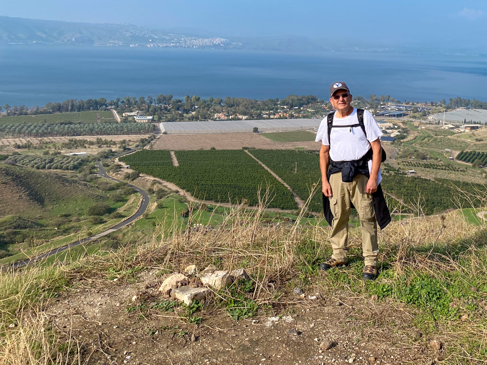 View West: The author on the trail to Sussita that approaches from the west, with Kibbutz En Gev and the Sea of Galilee below. I stopped to take a picture for some folks, and they insisted on taking one of me.