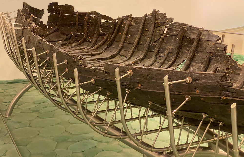The first-century AD Galilee Boat in the Yigal Allon Center at Kibbutz Ginosar. To preserve the wood, The boat was immersed in a chemical bath for seven years before it was put on display.