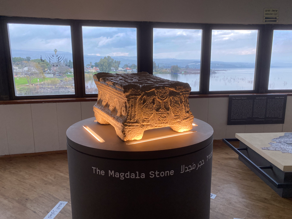 View east: A replica of the Magdala Stone discovered in the center of the synagogue of Magdala from the Second Temple Period. The original stone can be seen at Magdala (see “Magdala” on page 211).